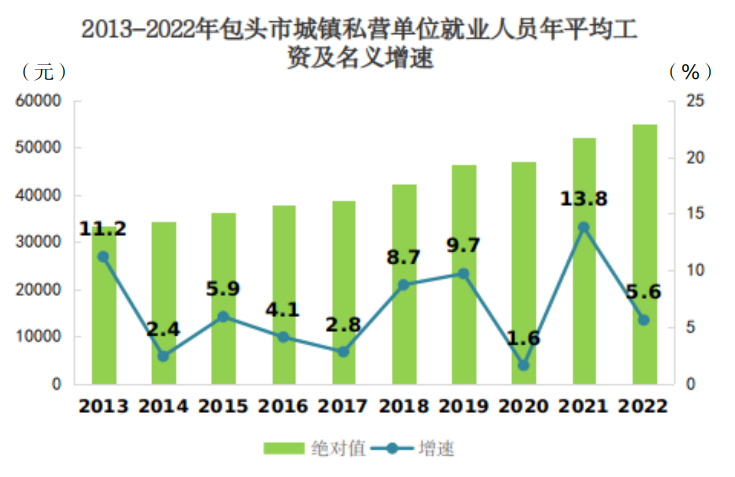 2022年包头市城镇私营单位就业人员年平均工资为54967元,与2021年的52041元相比,增加2926元,比上年名义增长[1]5.6%,增速比2021年回落8.2个百分点。扣除价格因素,2022年包头市城镇私营单位就业人员年平均工资实际增长4.1%。