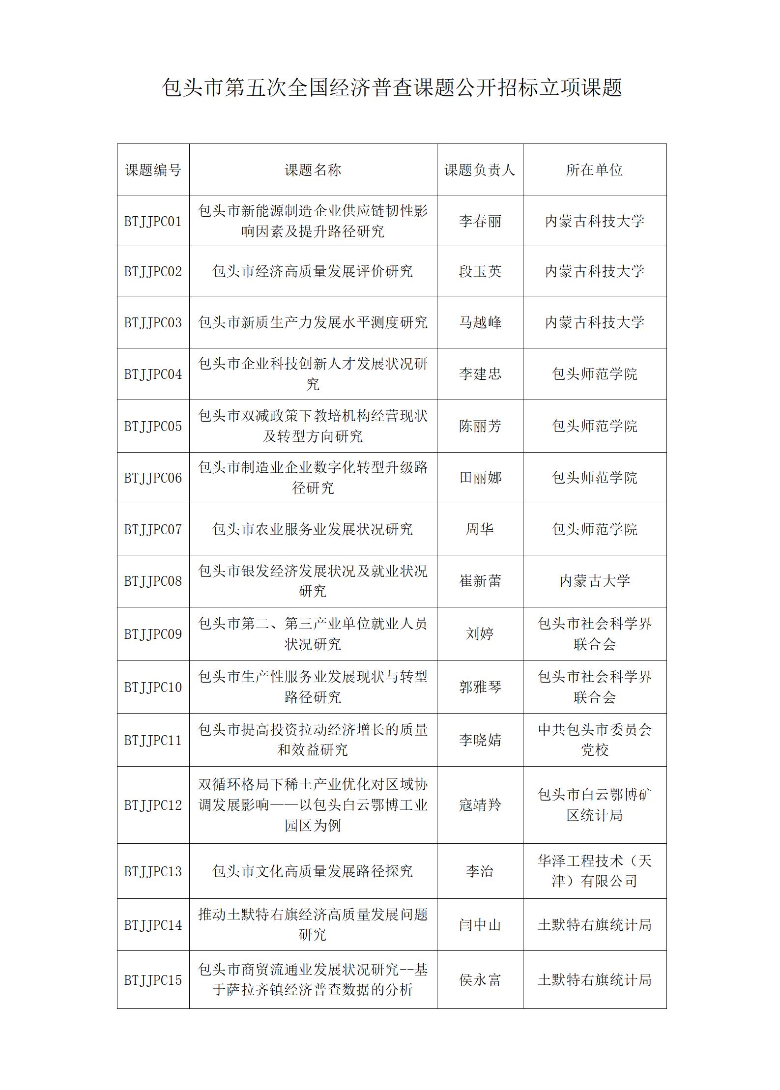 经公示,《包头市新能源制造企业供应链韧性影响因素及提升路径研究》等课题确定为包头市第五次全国经济普查公开招标立项课题。现予公告。