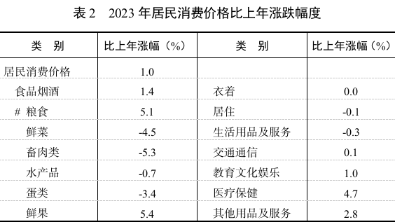 全年居民消费价格比上年上涨1.0%。分类别看,医疗保健类价格上涨4.7%,食品烟酒类价格上涨1.4%,教育文化娱乐类价格上涨1.0%,交通通信类价格上涨0.1%,居住类价格[3]下降0.1%。