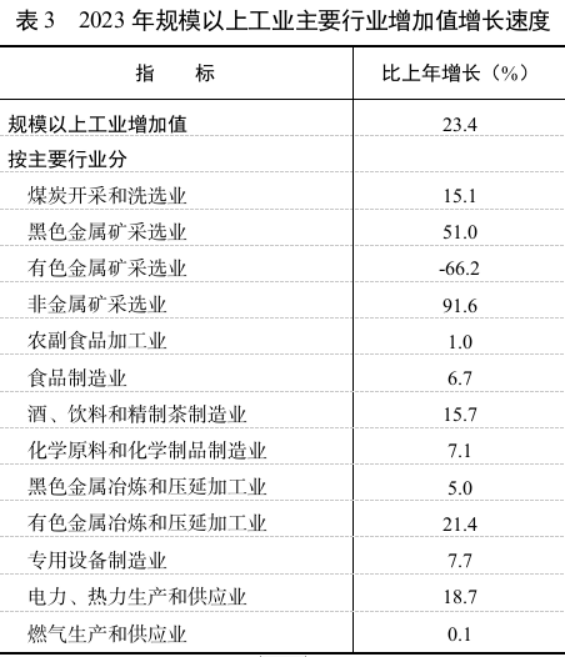 全年全部工业增加值比上年增长14.7%,其中,规模以上工业增加值增长23.4%。在规模以上工业中,分经济类型看,国有控股企业增加值增长19.8%,股份制企业增长23.2%,外商及港澳台商投资企业增长29.9%。分轻、重工业看,轻工业增加值下降0.3%,重工业增长23.8%。分门类看,采矿业增长27.2%,制造业增长23.7%,电力、热力、燃气及水生产和供应业增长14.8%。分行业看,煤炭开采和洗选业增长15.1%,非金属矿物制品业增长57.4%,化学原料和化学制品制造业增长7.1%,有色金属冶炼和压延加工业增长21.4%,专用设备制造业增长7.7%,计算机、通信和其他电子设备制造业增长9.4%,电力、热力生产和供应业增长18.7%。