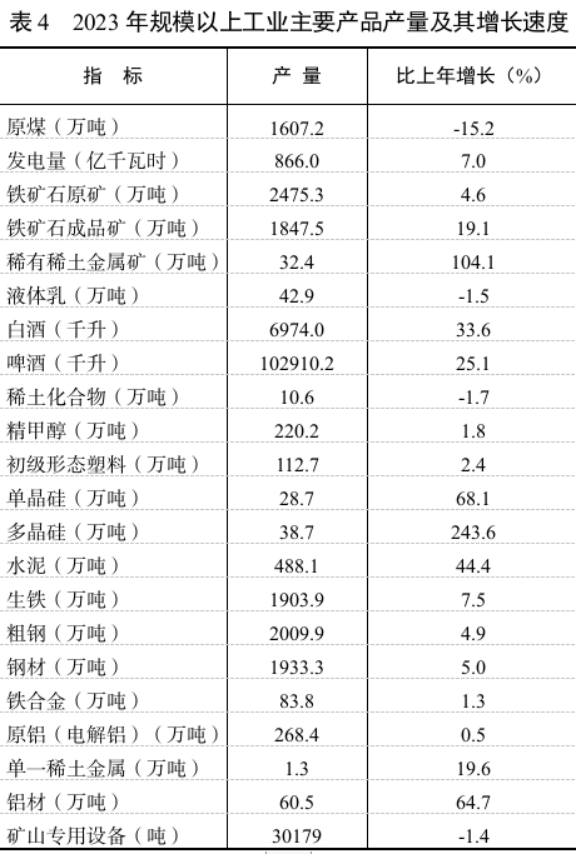 全年规模以上工业企业产品中,单晶硅产量28.7万吨,比上年增长68.1%;多晶硅产量38.7万吨,增长243.6%;稀有稀土金属矿产量32.4万吨,增长104.1%;原铝产量268.4万吨,增长0.5%。