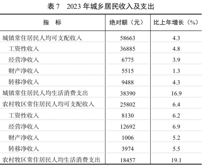 全年全体居民人均可支配收入54375元,比上年增长4.5%。按常住地分,城镇常住居民人均可支配收入58663元,增长4.3%;农村牧区常住居民人均可支配收入25802元,增长6.4%。
