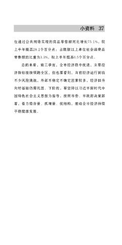 37 位通过公共网络实现的商品零售额同比增长75.1%,较 上半年提高28.2个百分点;占限额以上单位社会消费品 零售额的比重为3.3%,较上半年提高0.5个百分点。 总的来看,前三季度,全市经济稳中优进,主要经 济指标接续领跑全区,但也要看到,当前经济运行面临 不少风险挑战,外部不稳定不确定因素较多,经济回升 向好基础仍需巩固。下阶段,要坚持以习近平新时代中 国特色社会主义思想为指导,按照市委、市政府决策部 署,着力稳存量、抓增量、优结构,推动全市经济持续 平稳健康发展。