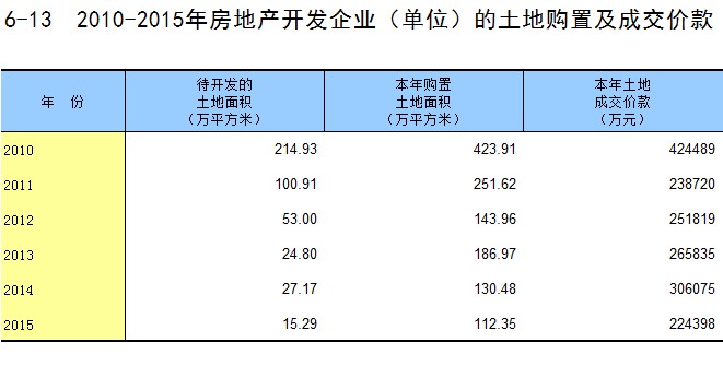 6-13 2010-2015年房地产开发企业(单位)的土地购置及成交价款