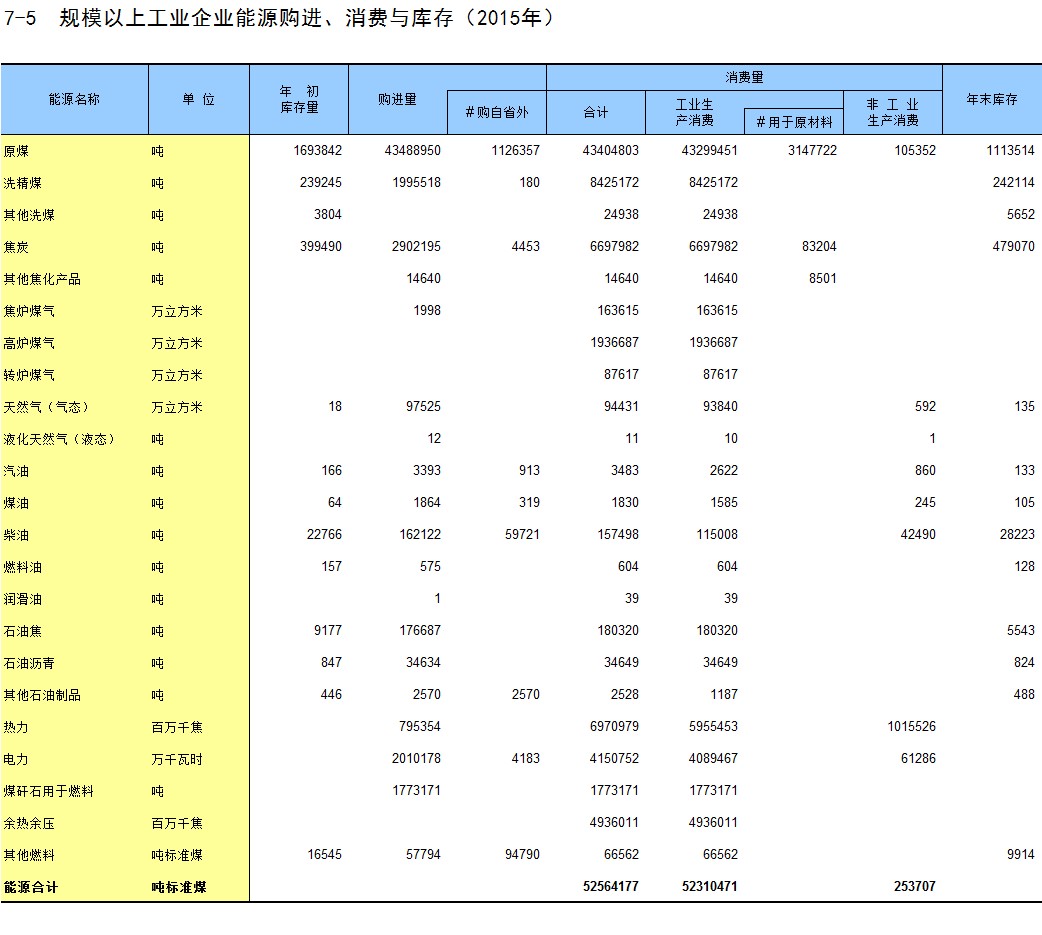 7-5 规模以上工业企业能源购进、消费与库存(2015年)