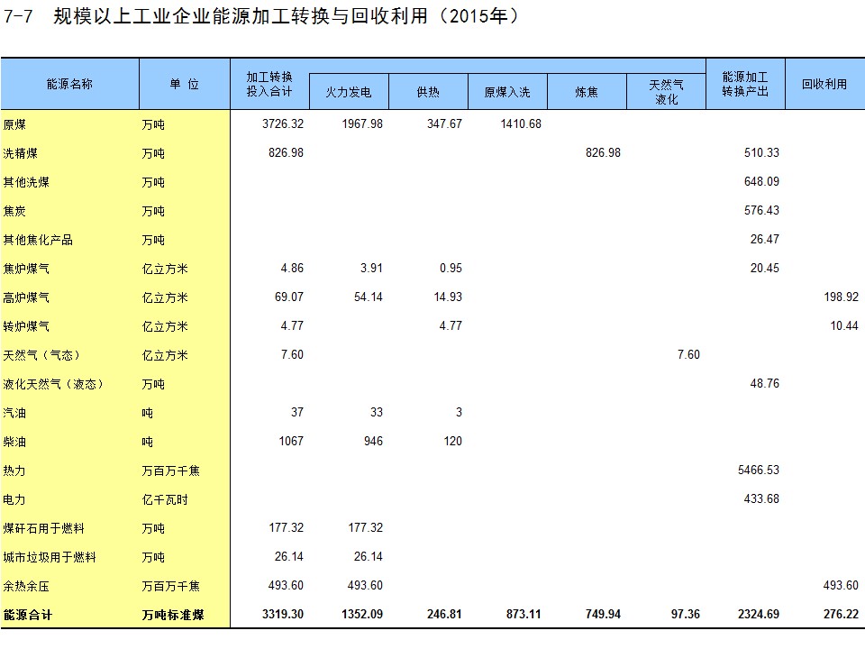 7-7 规模以上工业企业能源加工转换与回收利用(2015年)