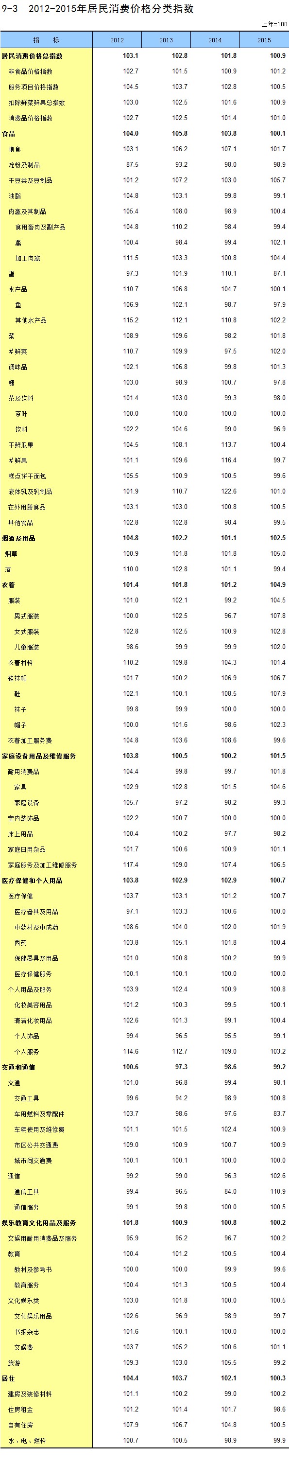 9-8 2012-2015年工业生产者购进价格指数(按新行业分)