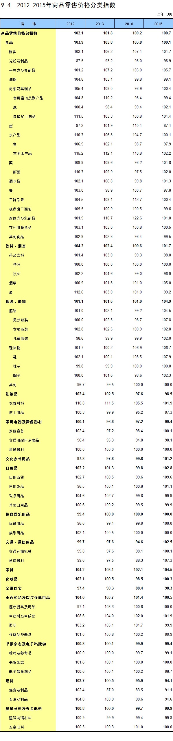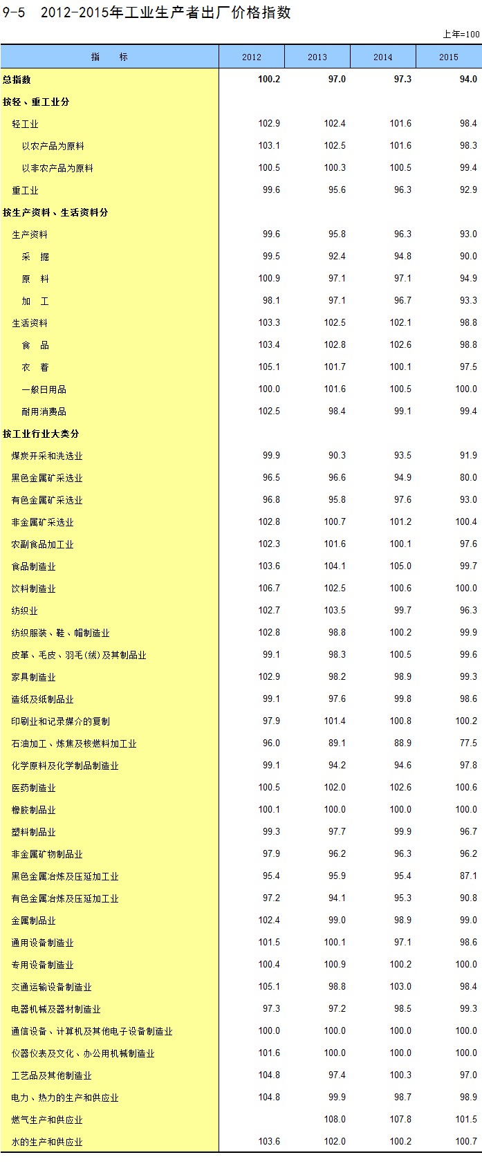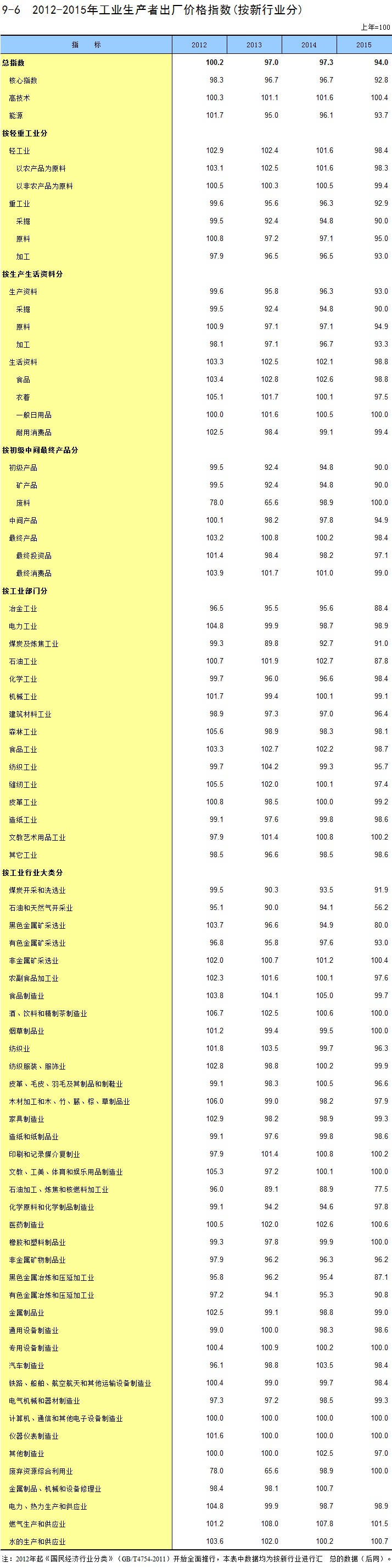 9-6 2012-2015年工业生产者出厂价格指数(按新行业分)