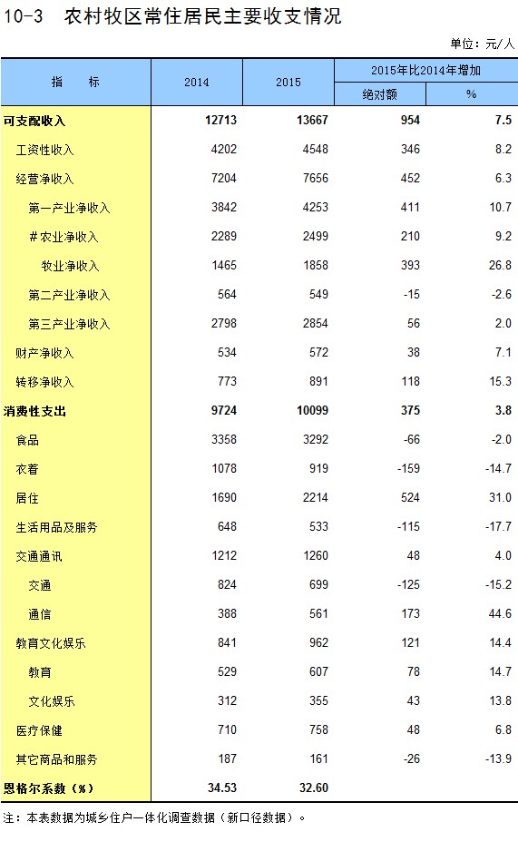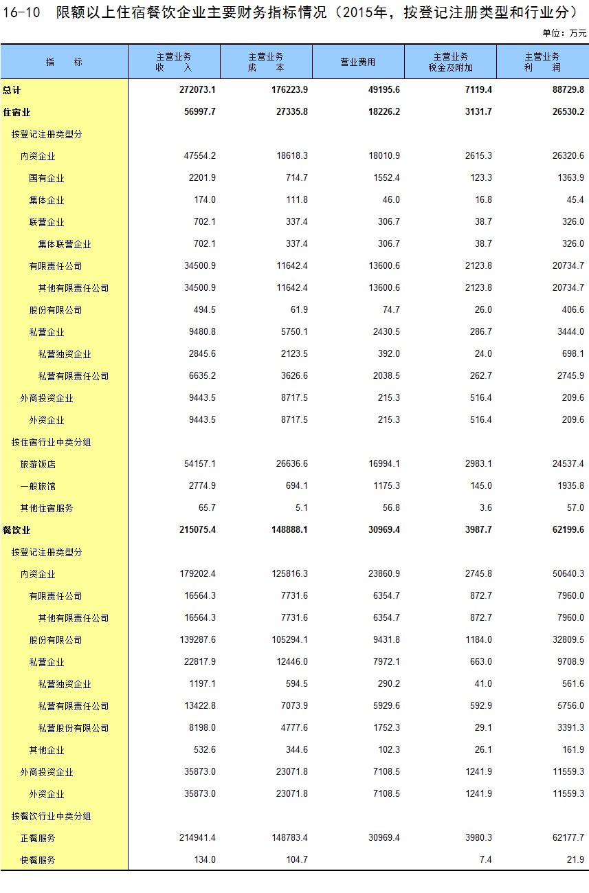 16-10 限额以上住宿餐饮企业主要财务指标情况(2015年,按登记注册类型和行业分)
