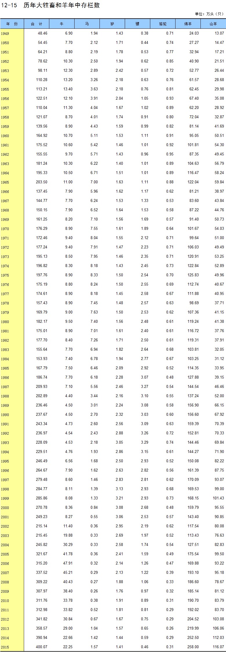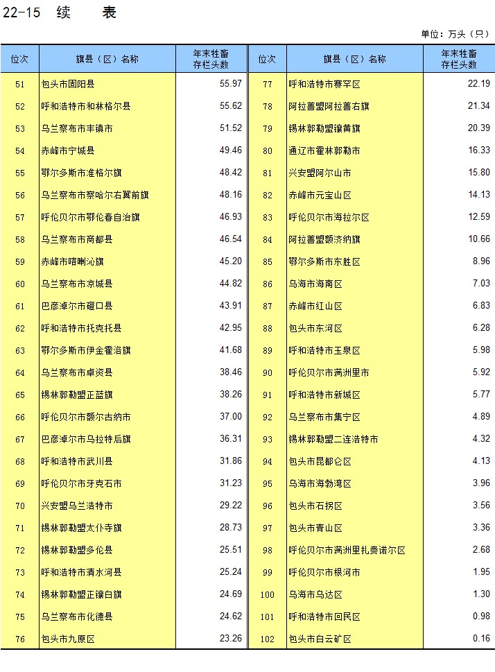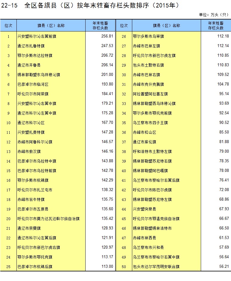 22-15 全区各旗县(区)按年末牲畜存栏头数排序(2015年)