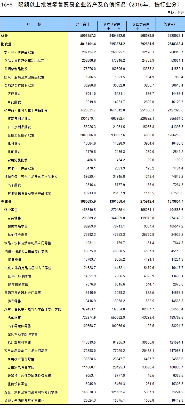 16-6 限额以上批发零售贸易企业资产及负债情况(2015年,按行业分)