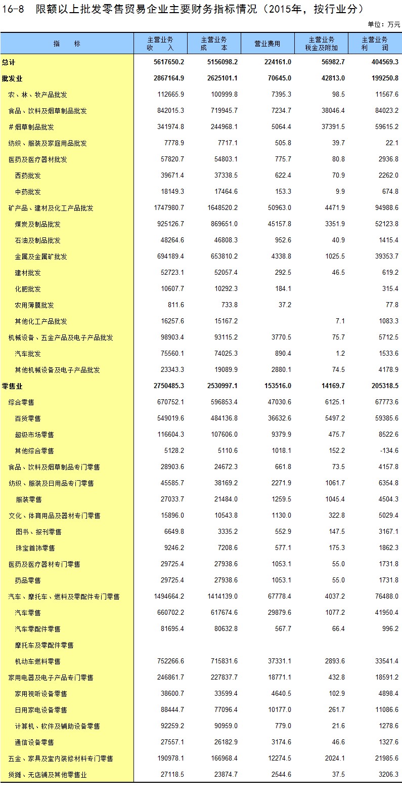 16-8 限额以上批发零售贸易企业主要财务指标情况(2015年,按行业分)