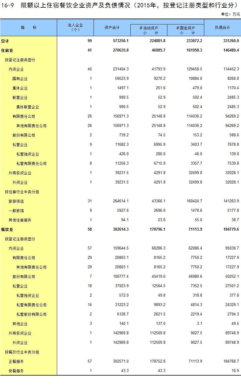 16-9 限额以上住宿餐饮企业资产及负债情况(2015年,按登记注册类型和行业分)
