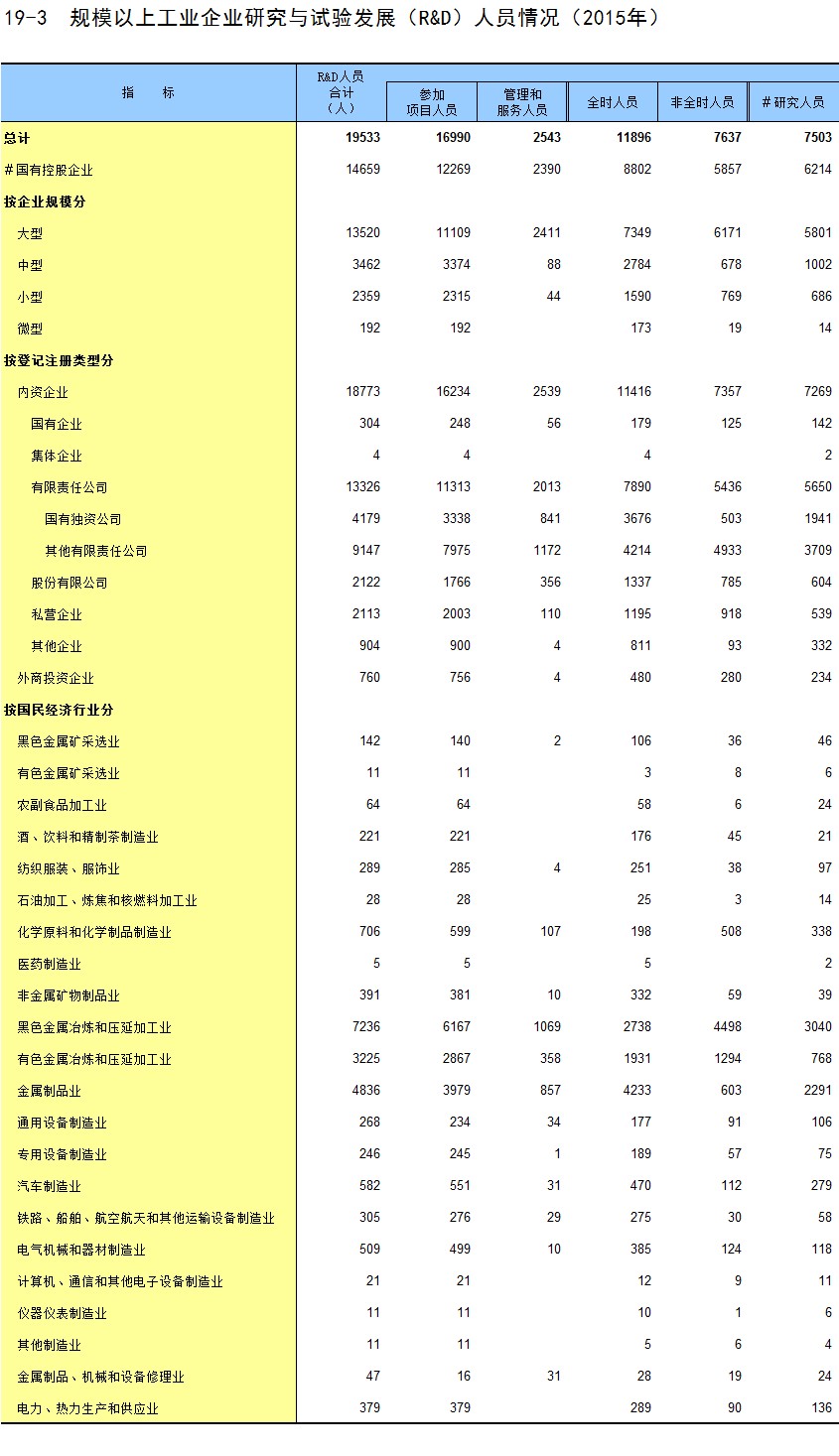 19-3 规模以上工业企业研究与试验发展(R&D)人员情况(2015年)
