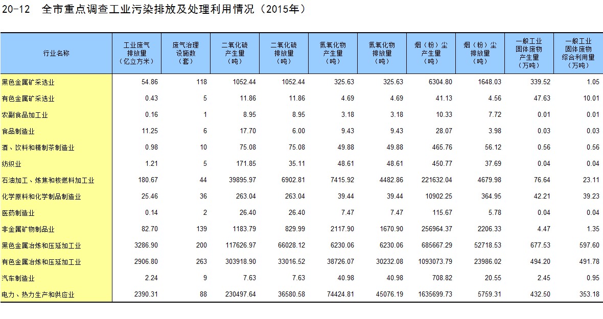 20-12 全市重点调查工业污染排放及处理利用情况(2015年)