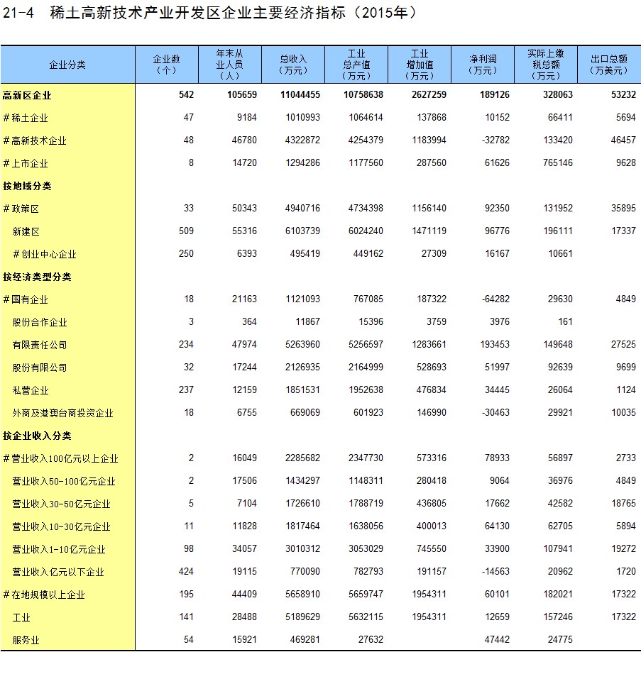 21-4 稀土高新技术产业开发区企业主要经济指标(2015年)