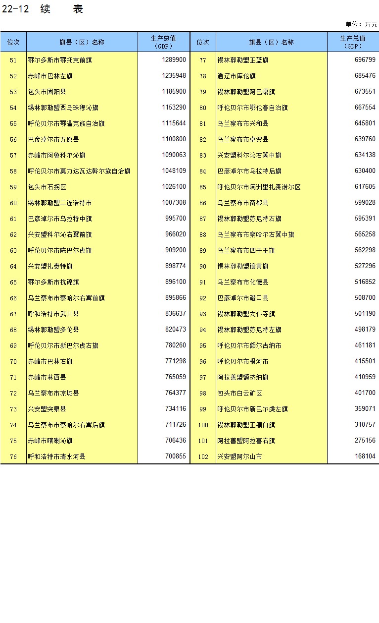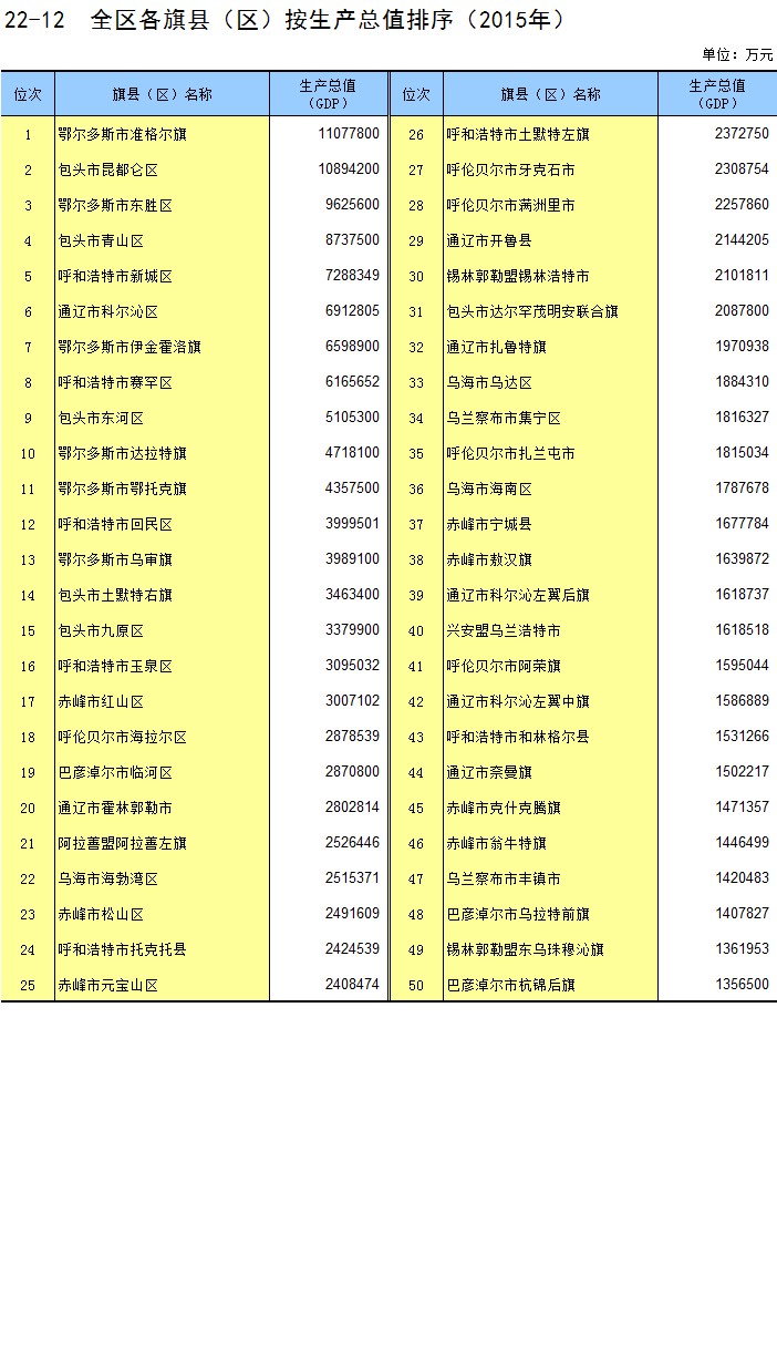 22-12 全区各旗县(区)按生产总值排序(2015年)