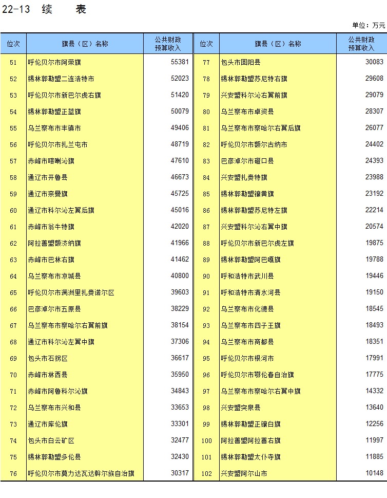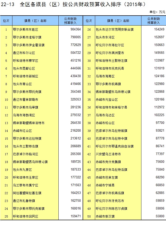 22-13 全区各旗县(区)按公共财政预算收入排序(2015年)