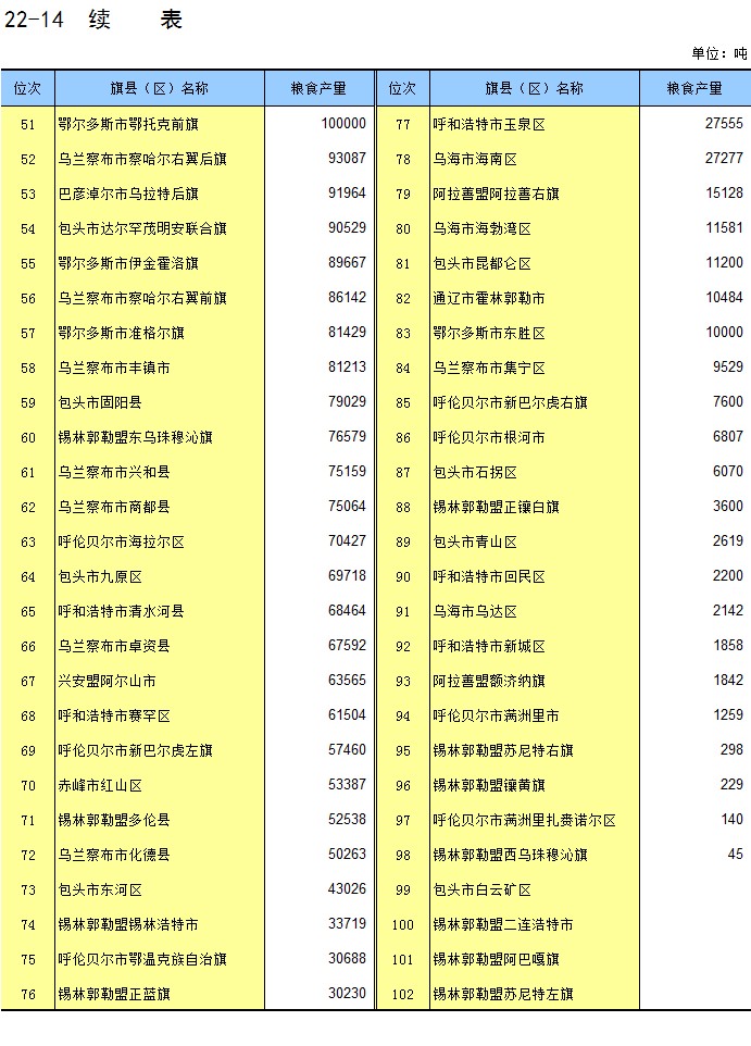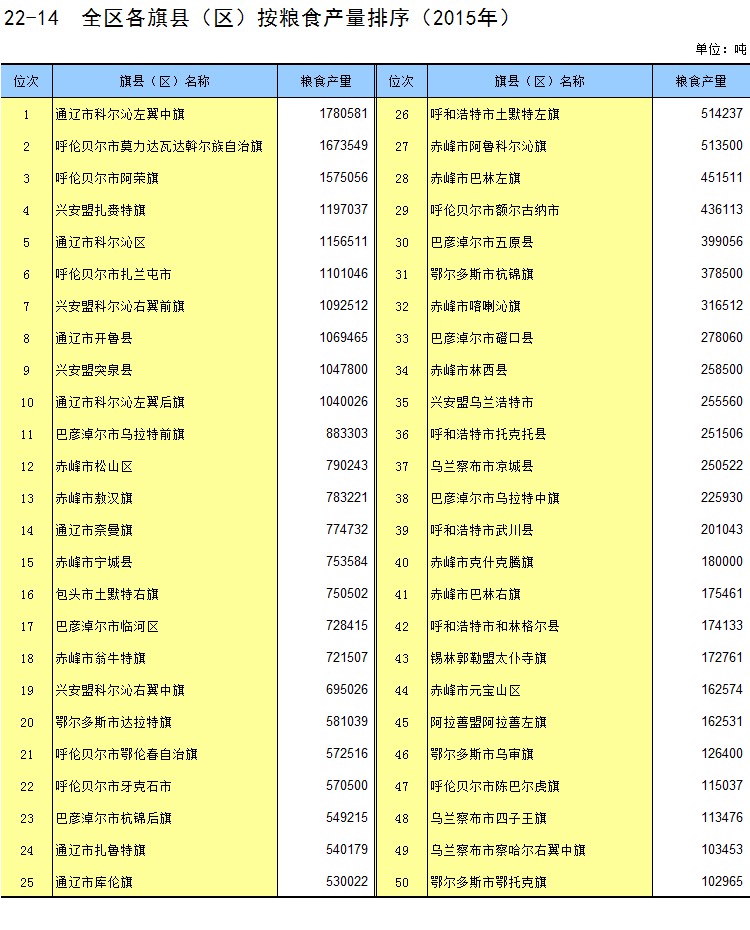 22-14 全区各旗县(区)按粮食产量排序(2015年)