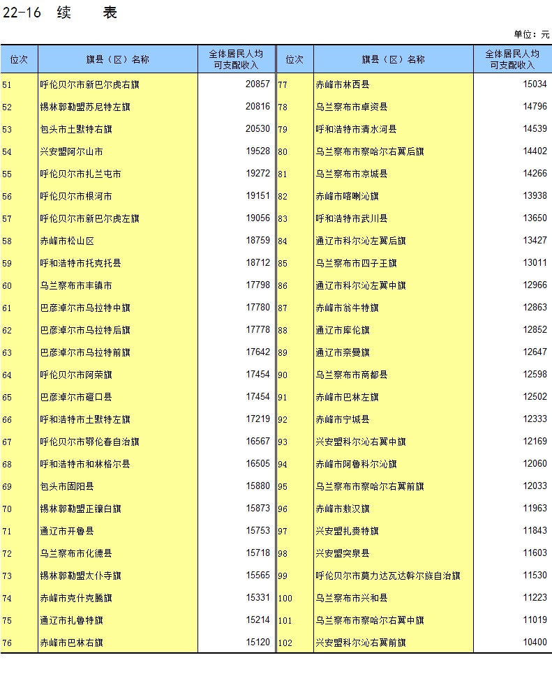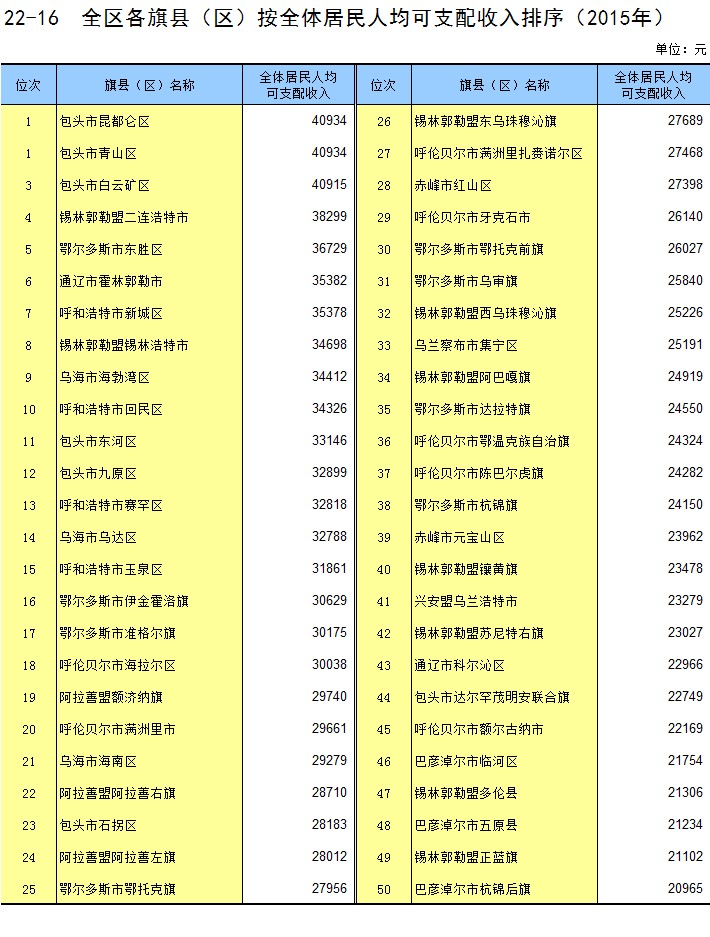 22-16 全区各旗县(区)按全体居民人均可支配收入排序(2015年)