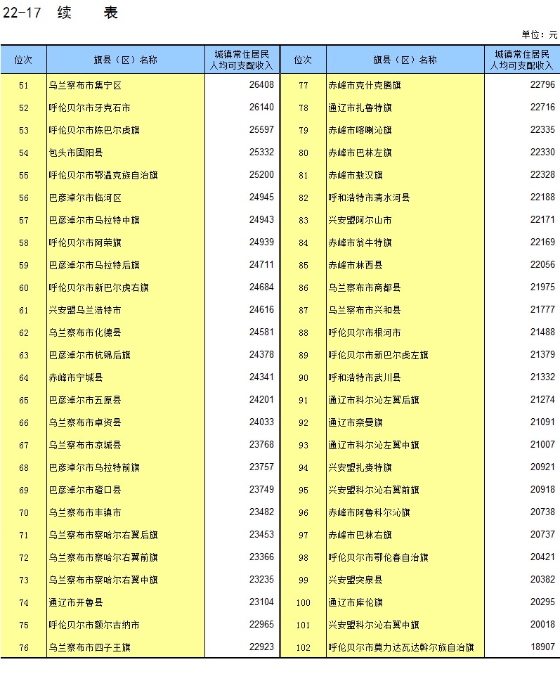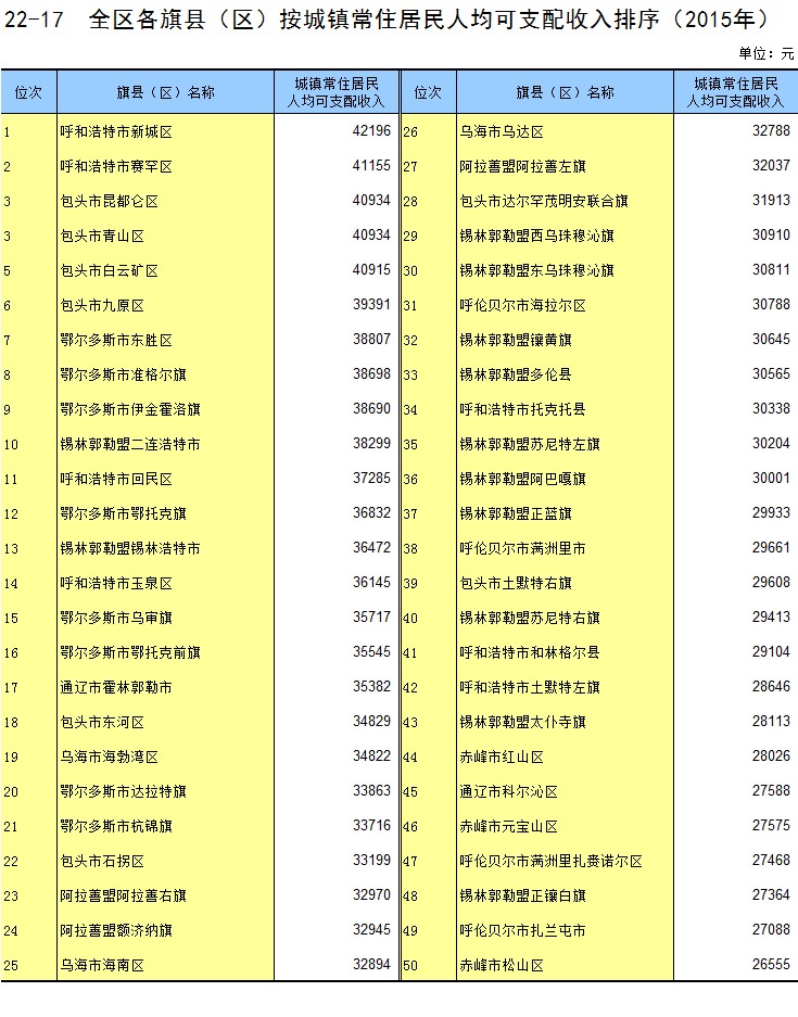 22-17 全区各旗县(区)按城镇常住居民人均可支配收入排序(2015年)