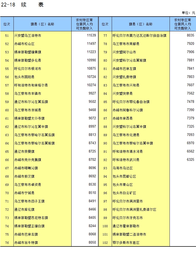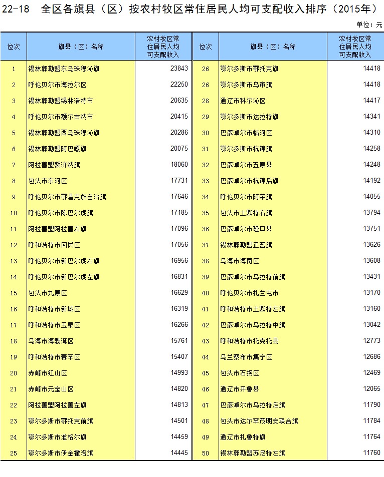22-18 全区各旗县(区)按农村牧区常住居民人均可支配收入排序(2015年)