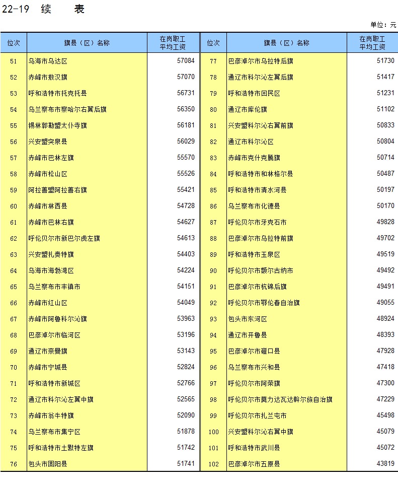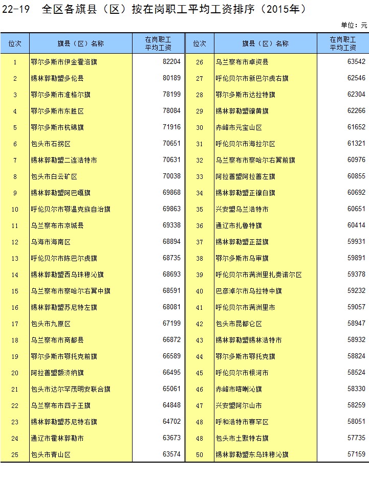22-19 全区各旗县(区)按在岗职工平均工资排序(2015年)