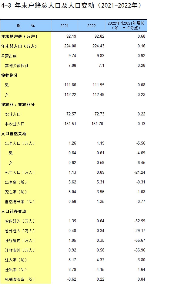 4-3 年末户籍总人口及人口变动(2021-2022年)