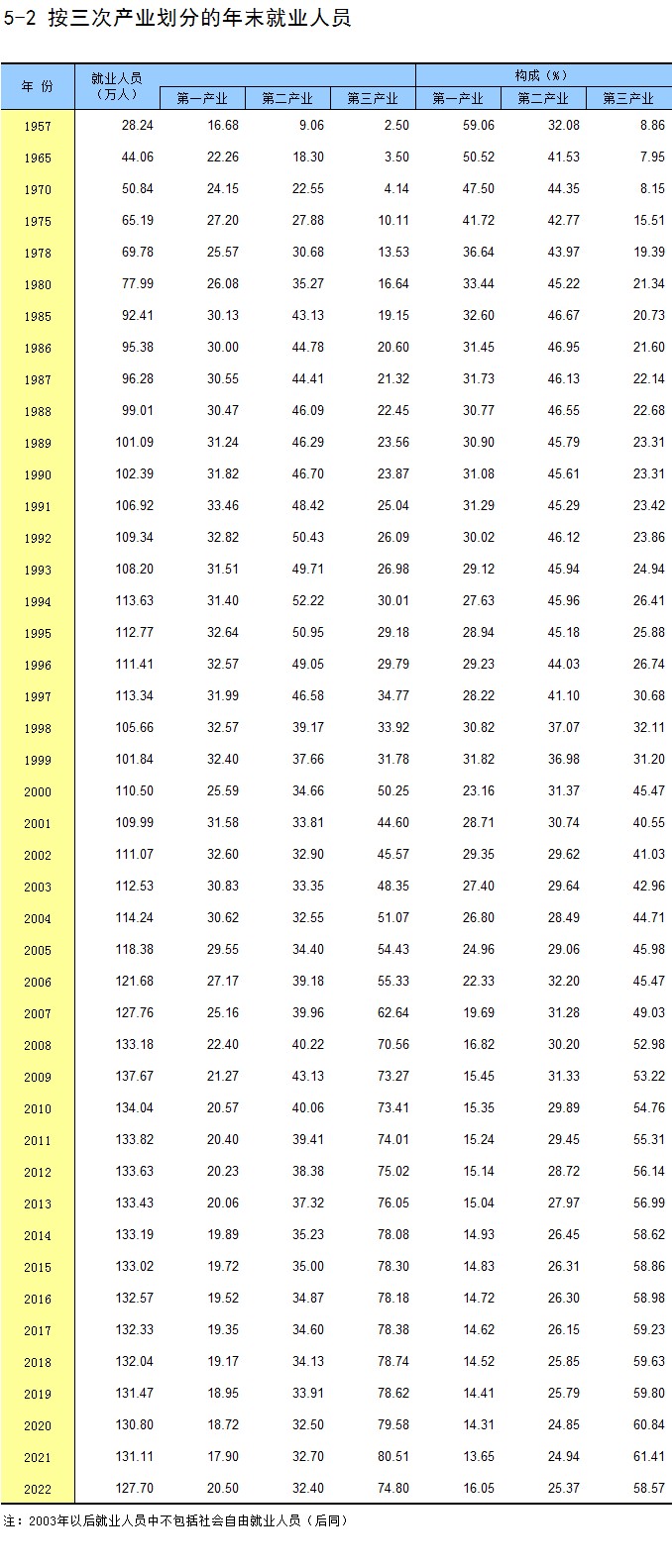 5-2 按三次产业划分的年末就业人员