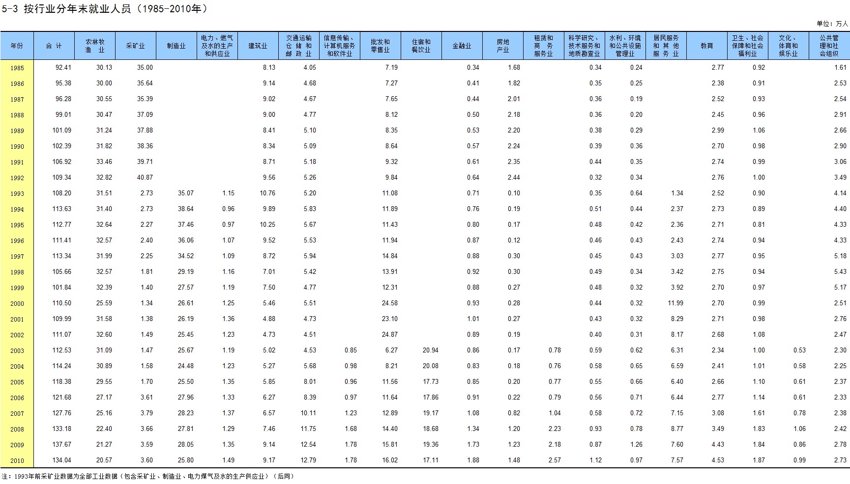 5-3 按行业分年末就业人员(1985-2010年)