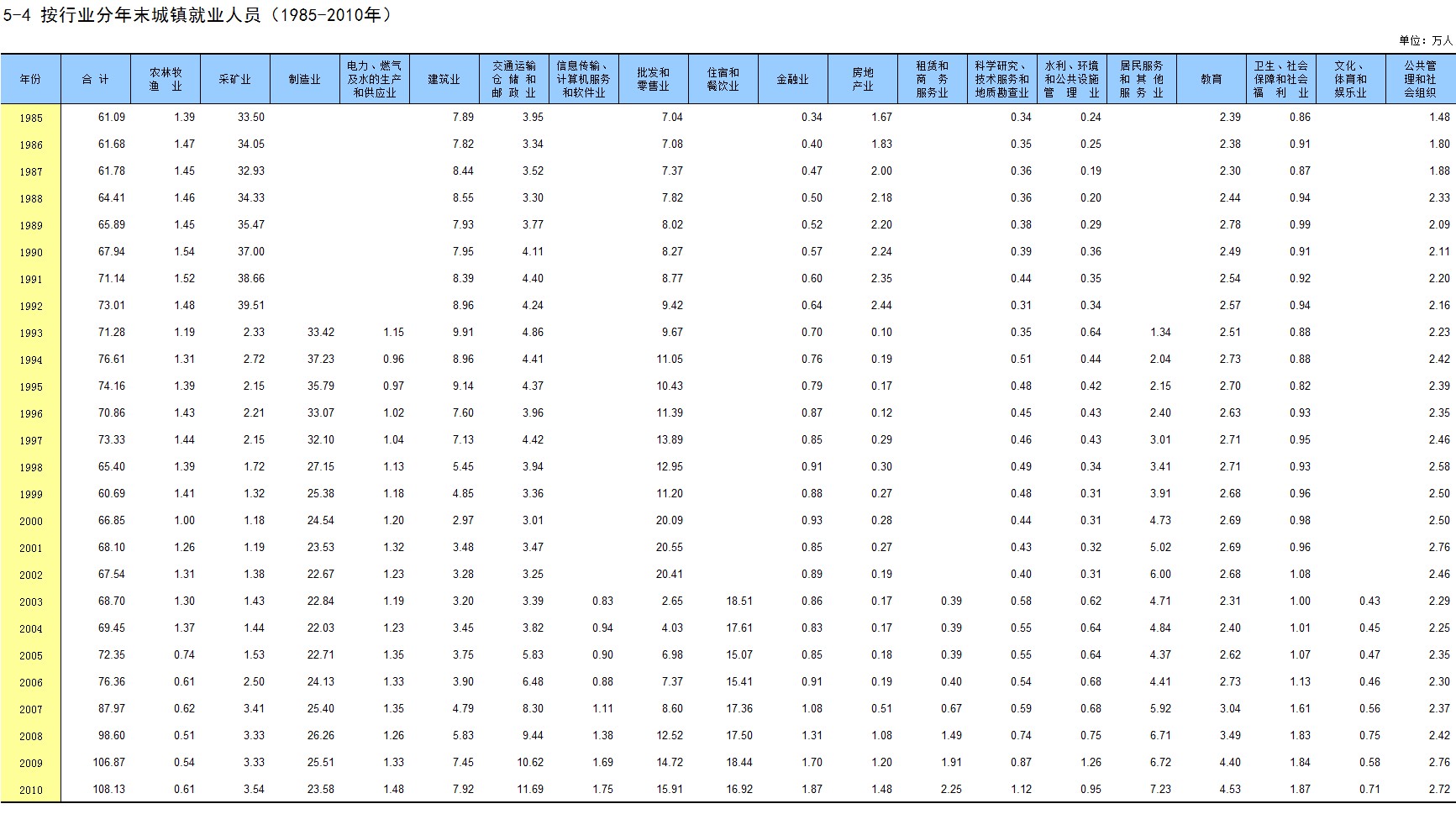 5-4 按行业分年末城镇就业人员(1985-2010年)