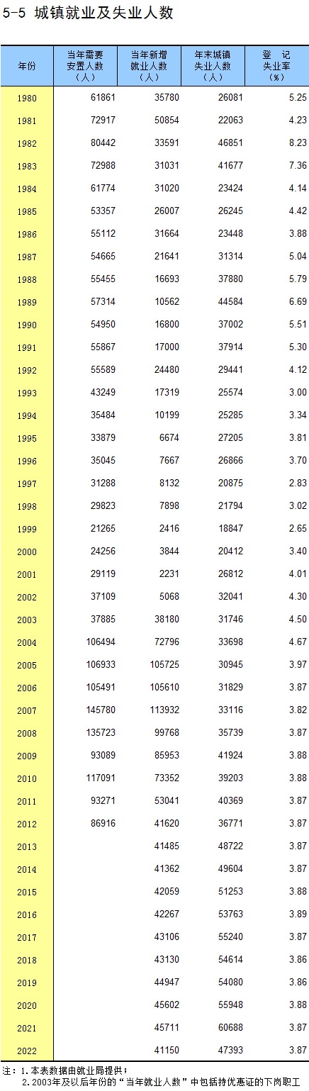 5-5 城镇就业及失业人数