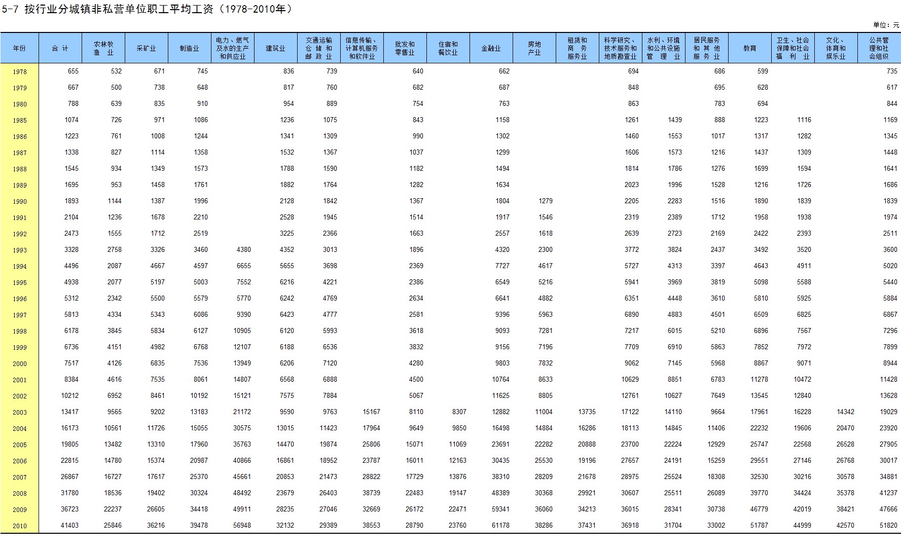 5-7 按行业分城镇非私营单位职工平均工资(1978-2010年)