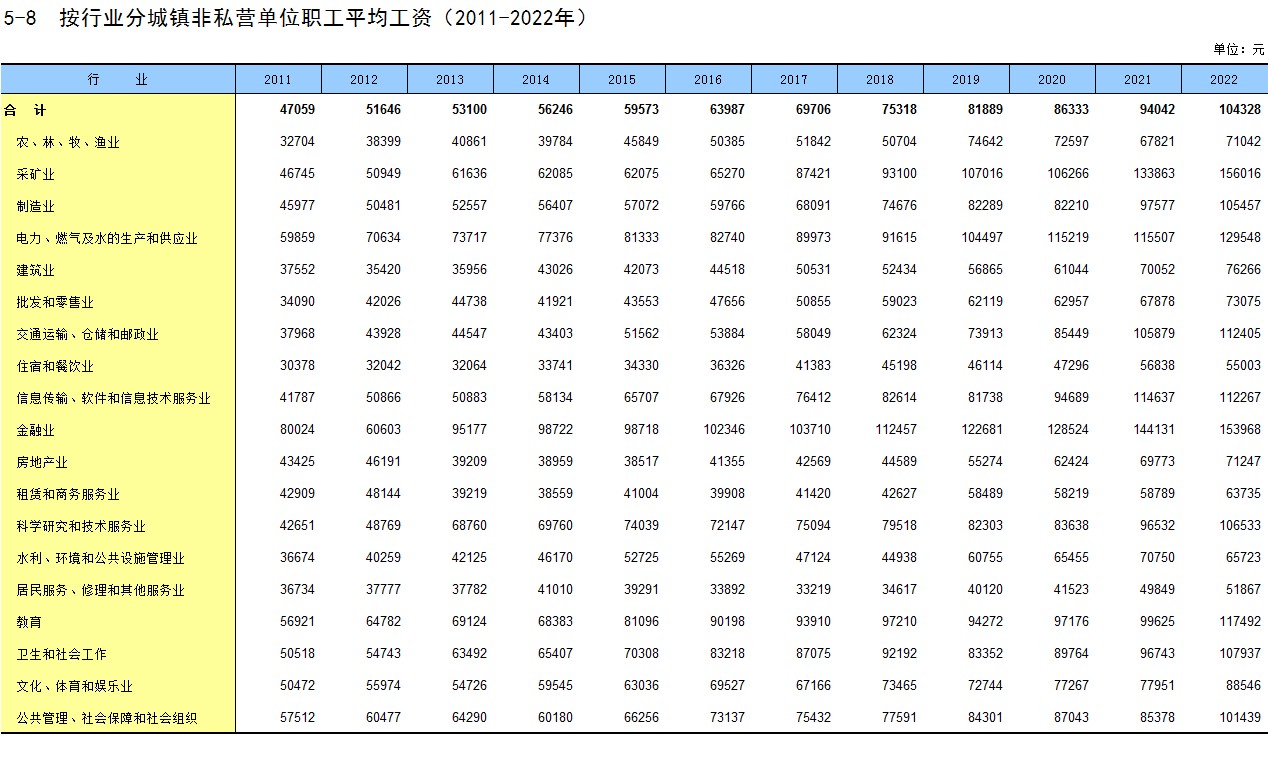 5-8 按行业分城镇非私营单位职工平均工资(2011-2022年)