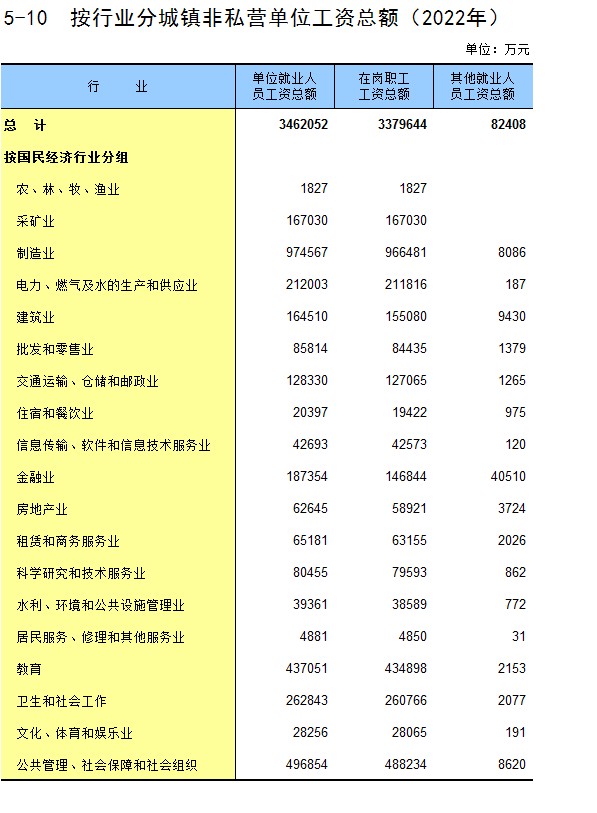 5-10 按行业分城镇非私营单位工资总额(2022年)