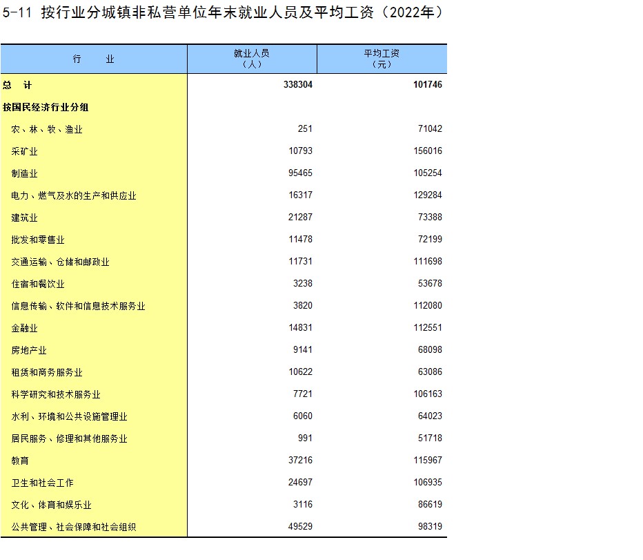 5-11 按行业分城镇非私营单位年末就业人员及平均工资(2022年)