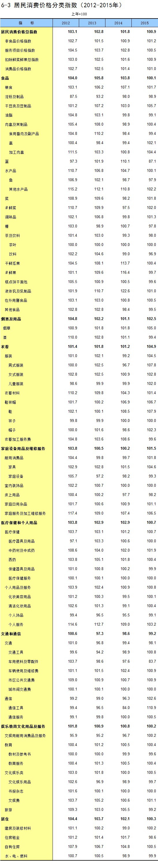6-3 居民消费价格分类指数(2012-2015年)