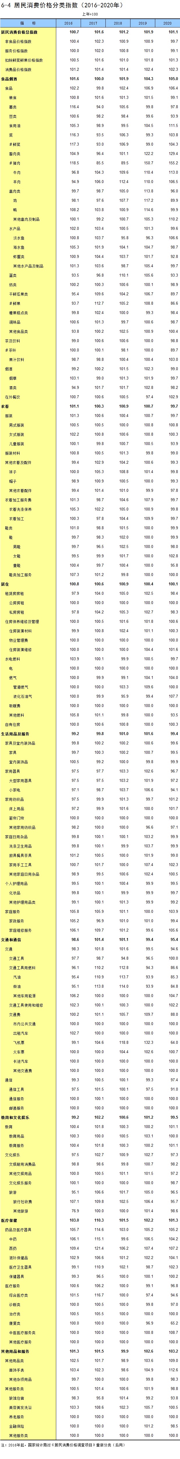 6-4 居民消费价格分类指数(2016-2020年)