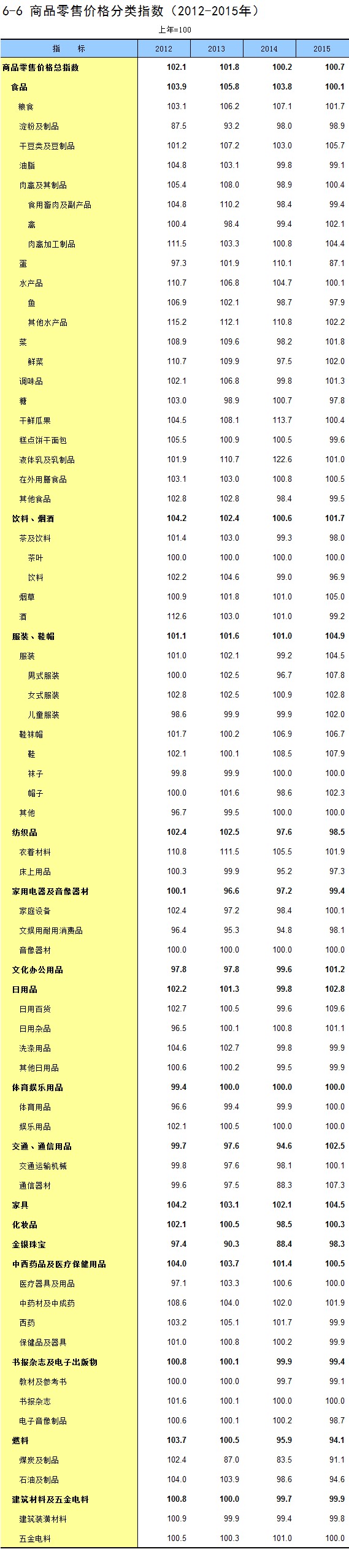 6-6 商品零售价格分类指数(2012-2015年)