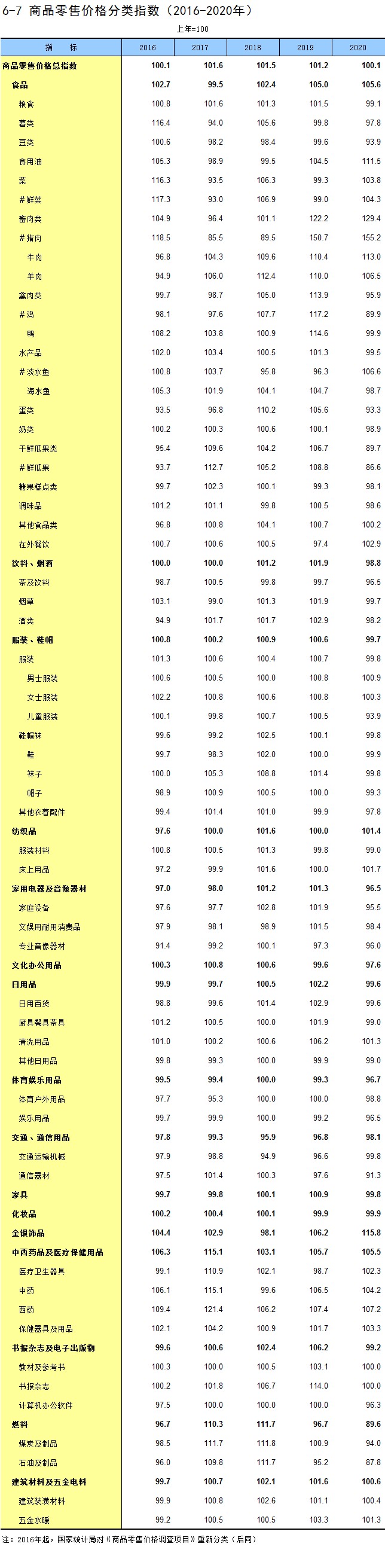 6-7 商品零售价格分类指数(2016-2020年)