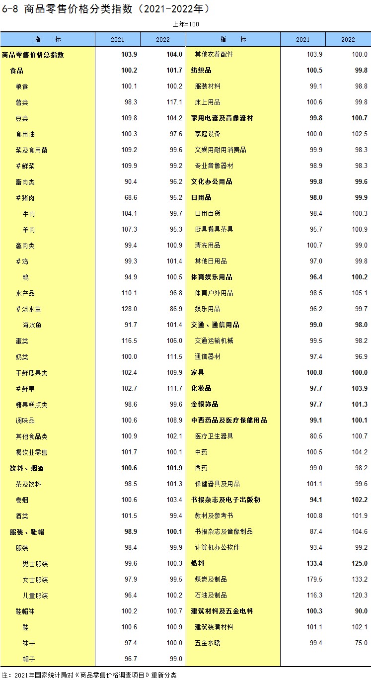 6-8 商品零售价格分类指数(2021-2022年)