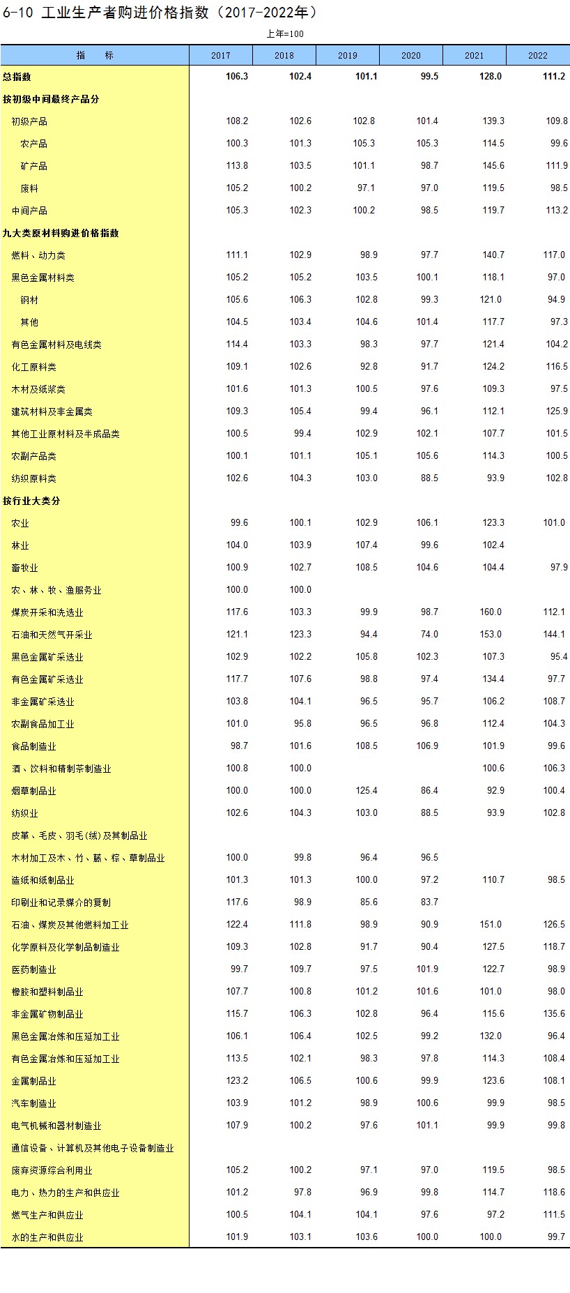 6-10 工业生产者购进价格指数(2017-2022年)
