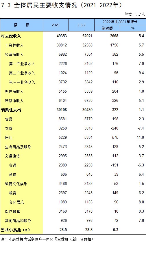 7-3 全体居民主要收支情况(2021-2022年)