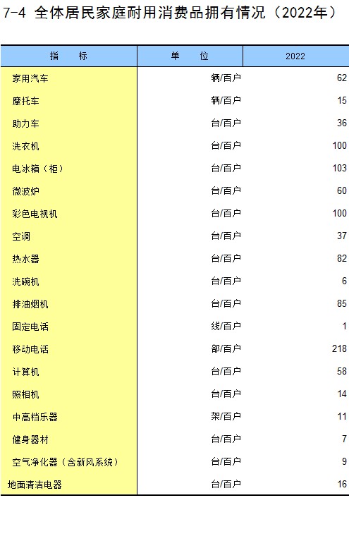 7-4 全体居民家庭耐用消费品拥有情况(2022年)