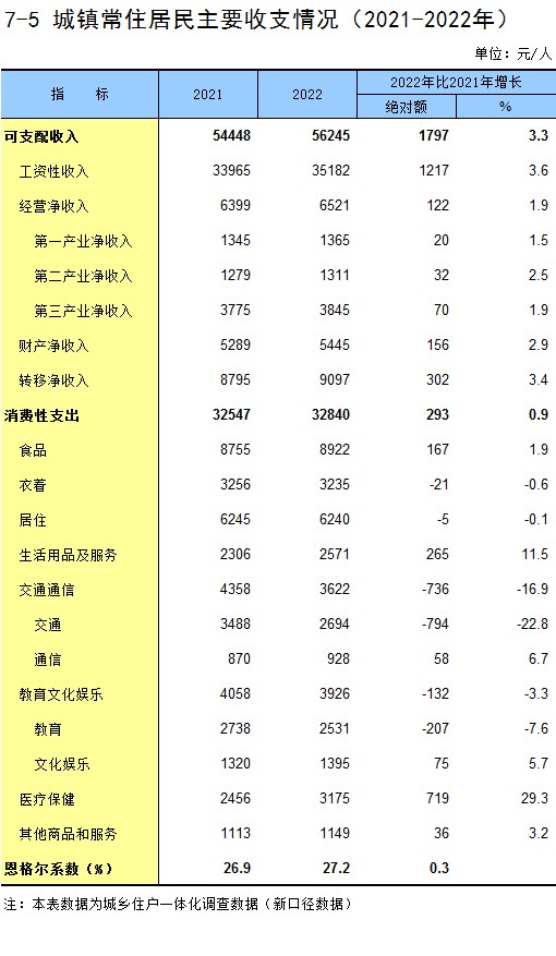 7-5 城镇常住居民主要收支情况(2021-2022年)