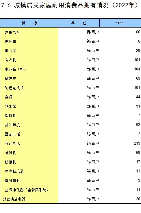 7-6 城镇居民家庭耐用消费品拥有情况(2022年)