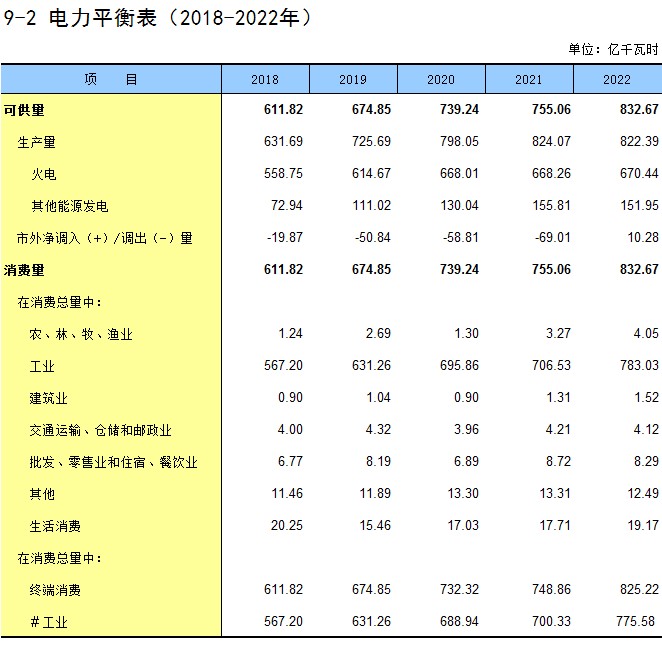 9-2 电力平衡表(2018-2022年)