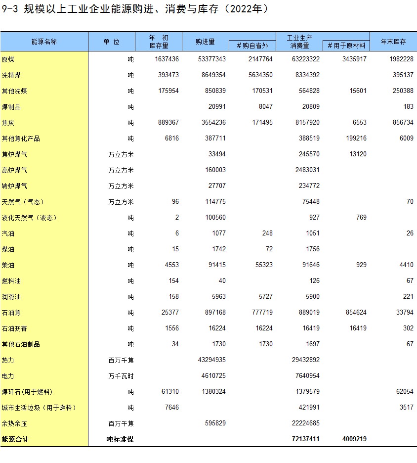 9-3 规模以上工业企业能源购进、消费与库存(2022年)