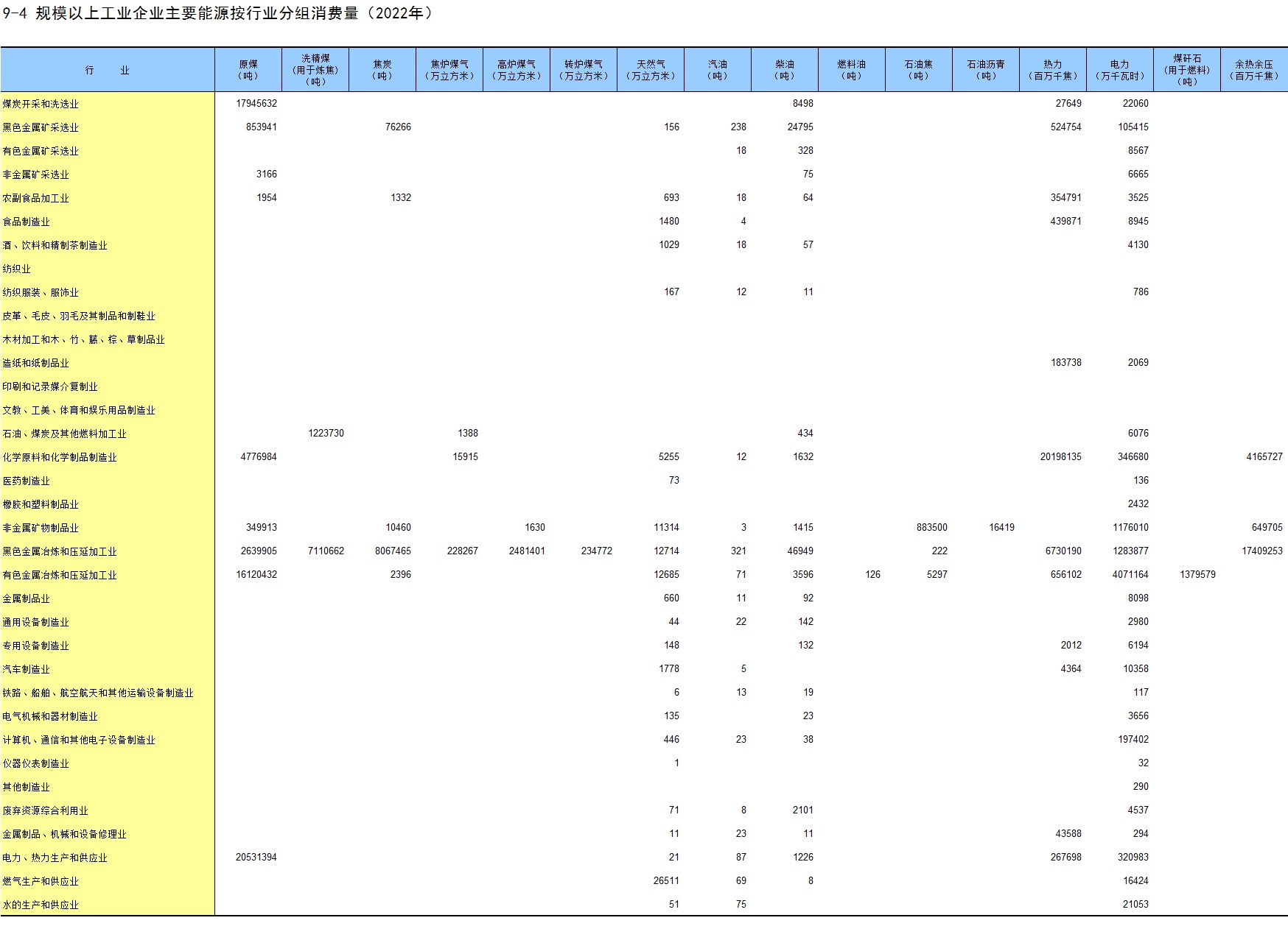 9-4 规模以上工业企业主要能源按行业分组消费量(2022年)