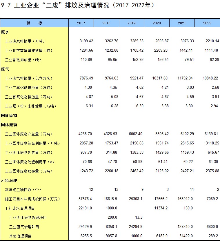 9-7 工业企业“三废”排放及治理情况(2017-2022年)